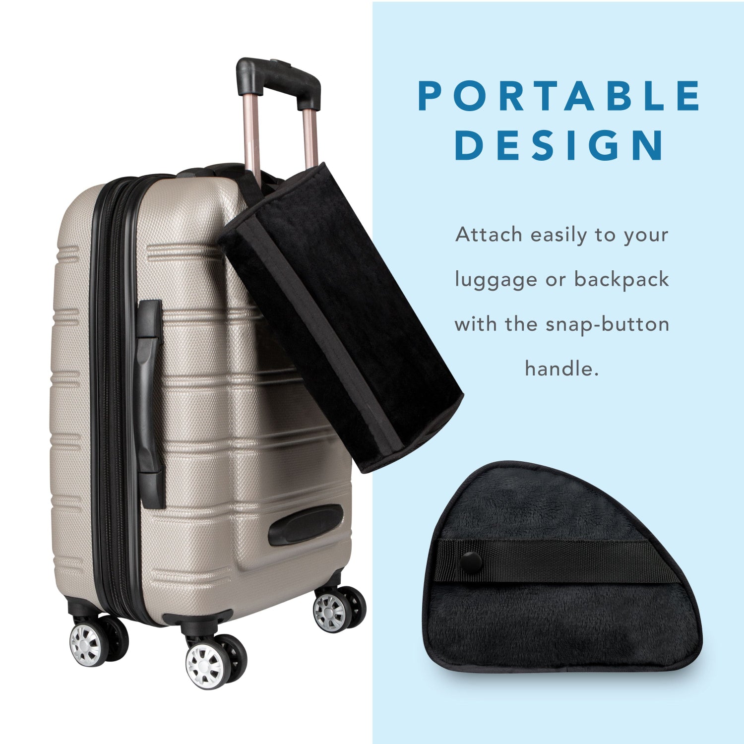 The unique design of the Microbead Tablet Pillow allows for comfortable and efficient tablet use. Experience the conforming cushion as you place your tablet pillow in your lap. Store chargers, earphones, and other accessories into the side pocket to keep them handy. The snap-on handle attaches easily to luggage or backpacks making this a great product to travel with.