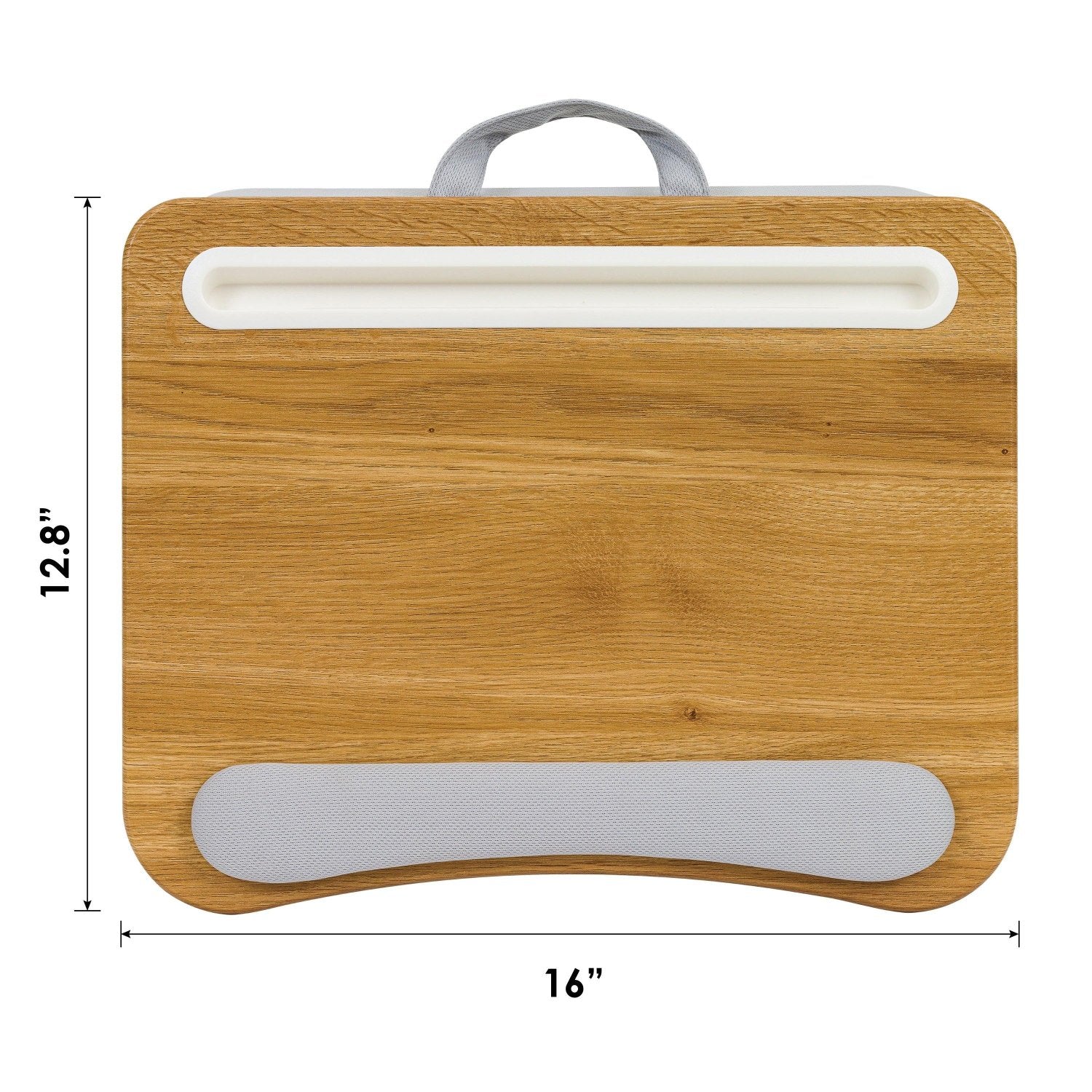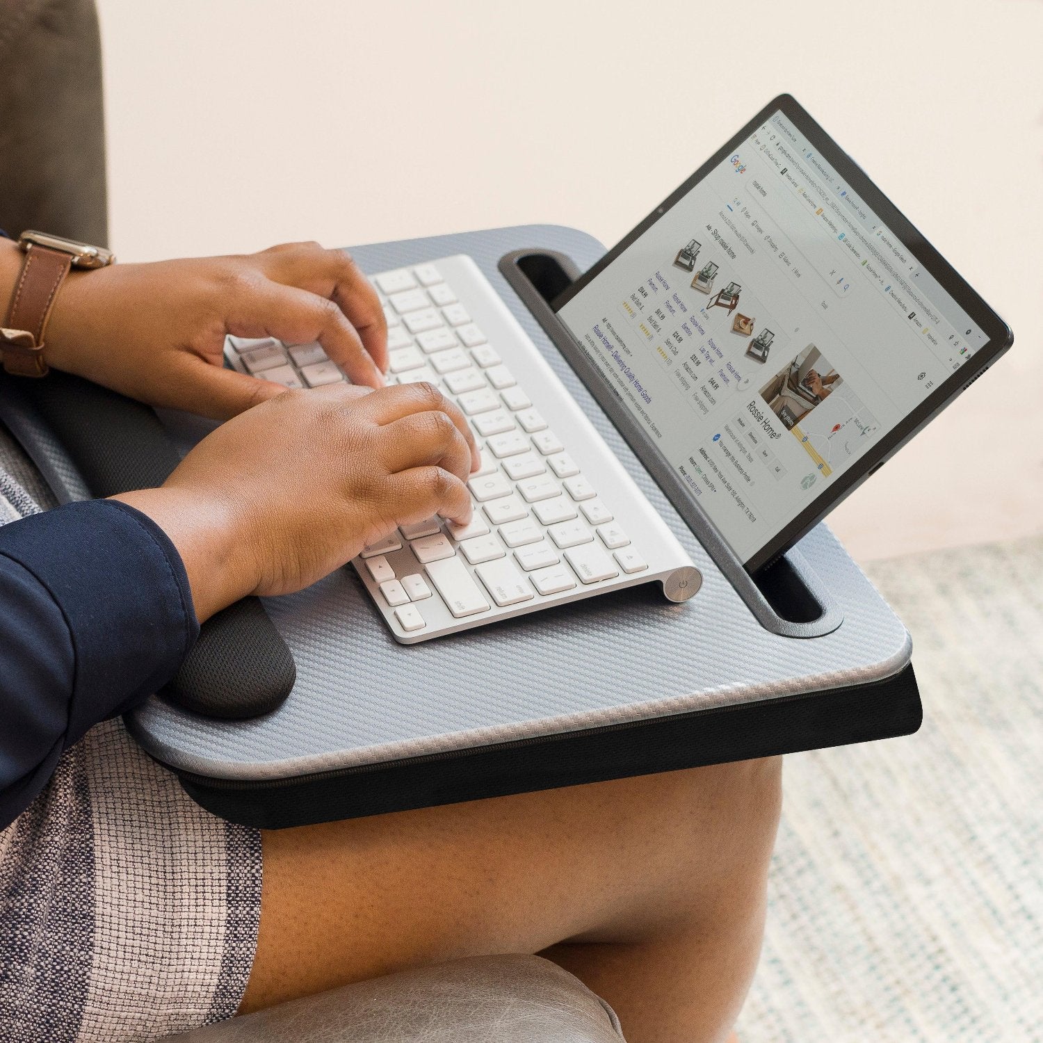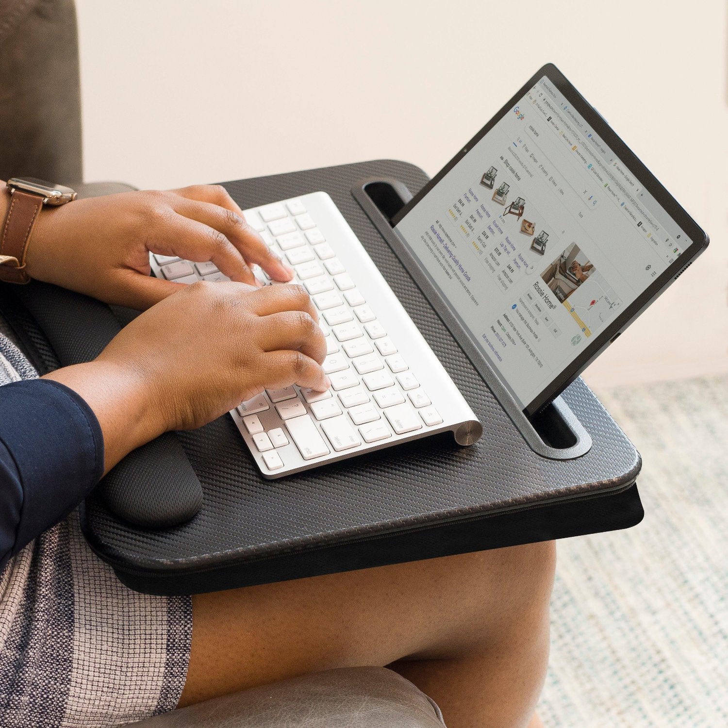 The Memory Foam Lap Desk is the ideal companion for those who switch back and forth between working and entertainment. Prop your tablet up to 10.5” into the media slot for hands-free use at an optimal screen viewing angle. The Memory Foam Lap Desk’s foam-padded wrist rest is an ergonomic feature that provides comfort while typing or completing any task on the surface. The foam cushion conforms to your lap for a perfect fit. When you’re ready to head out, use the reinforced carrying handle to take this lap desk with you anywhere.